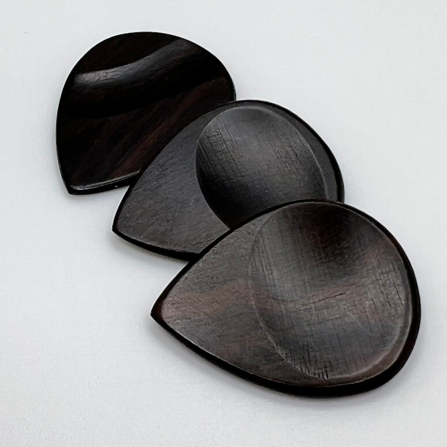 Ebony Grip Picks with thumb and finger grooves for top control and crisp tone. Durable, polished picks for electric or acoustic guitars. Artist quality.