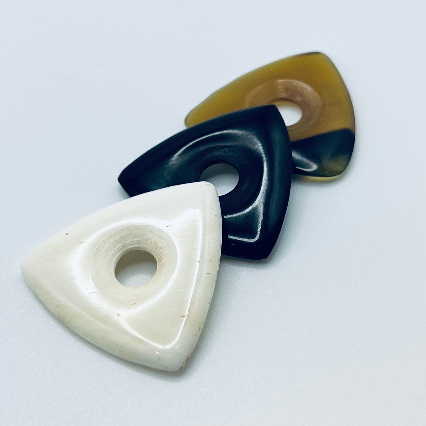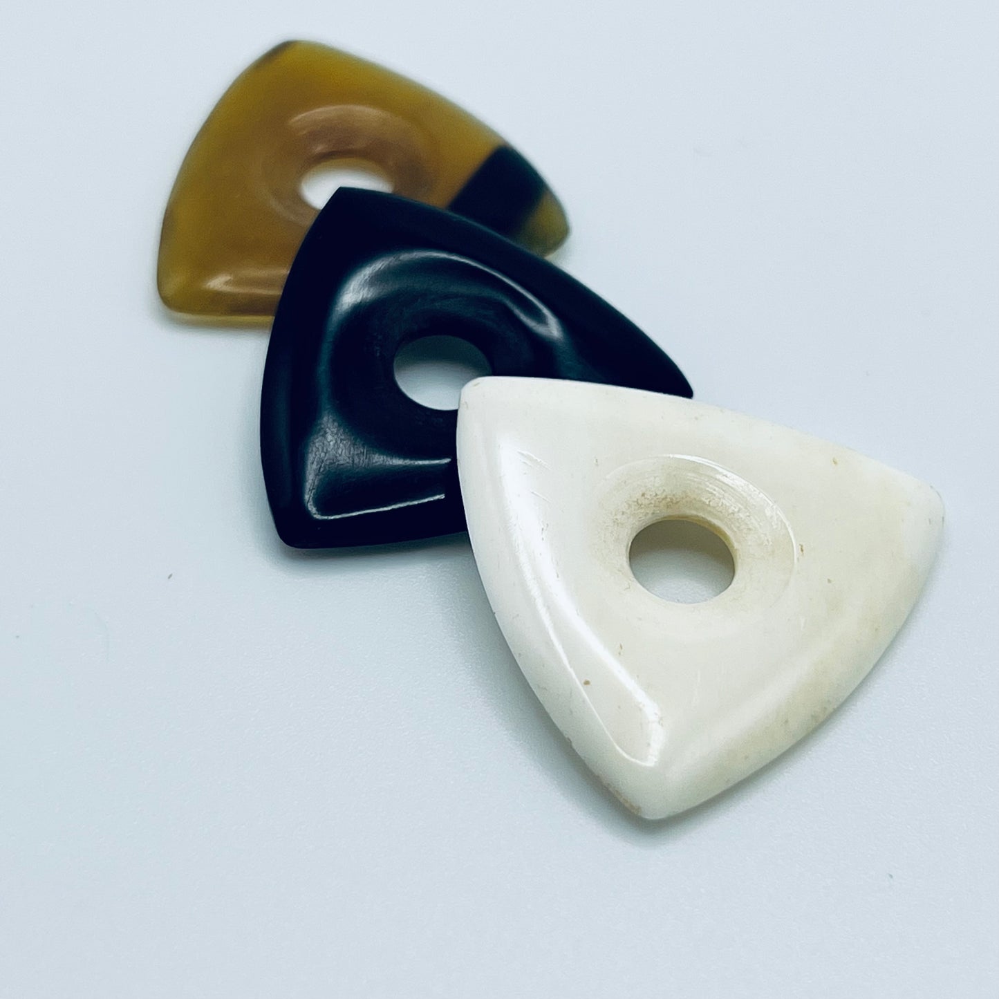 Exotic TriStar guitar picks with grip hole for electric guitar. Hard, artist-quality picks made from Buffalo Bone, Black Horn & Amber Horn by US Blues®.