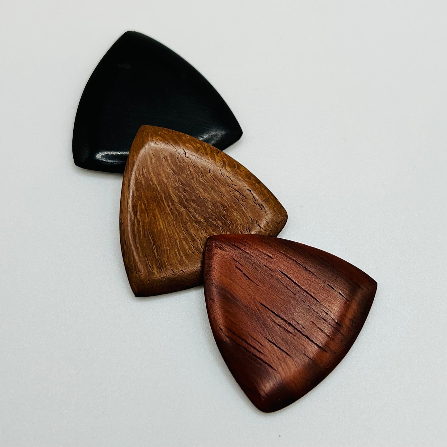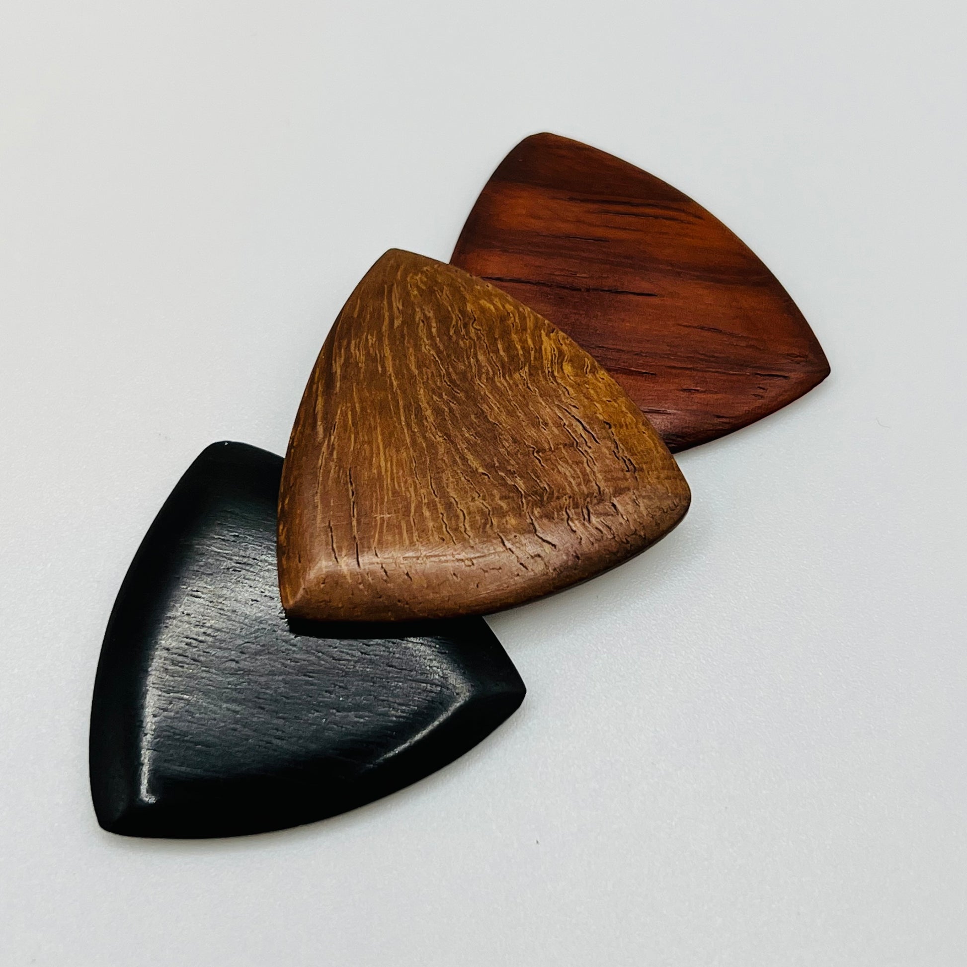 TriTip Wood Guitar Picks in a Trilogy Sampler crafted for acoustic tone. Features Ebony, Rosewood & Padauk in a sculpted triangle design.